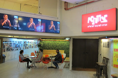 צוותא, הקבילו את פני שלושה מסכי טלוויזיה מבריקים המשדרים בלופ מתוכניות צוותא בהווה. השלט המאיר עיניים של