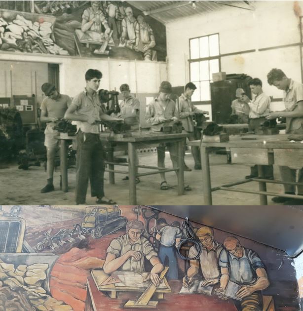 | ציור קיר בבית הספר המקצועי בשריד של הנער – אלכס לוי בן - ה15 משער העמקים - שנות החמישים המוקדמות בהשפעת הסגנון המקסיקני |